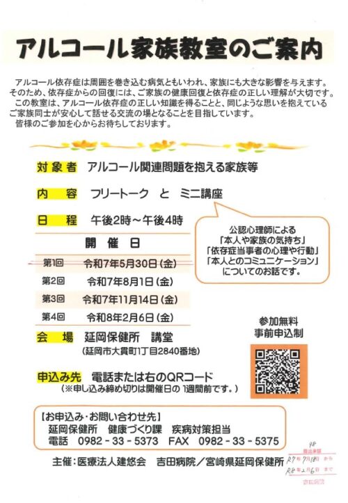 今回のブログは、令和7年度から3ヶ月に1回開催している アルコール家族教室についての紹介です。