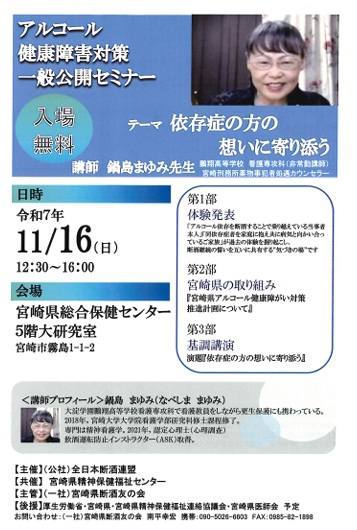 令和7年11月16日(日)、宮崎県総合保健福祉センターにて「依存症の方の想いに寄り添う」をテーマに公開セミナーが催されます(ポスター参照)。